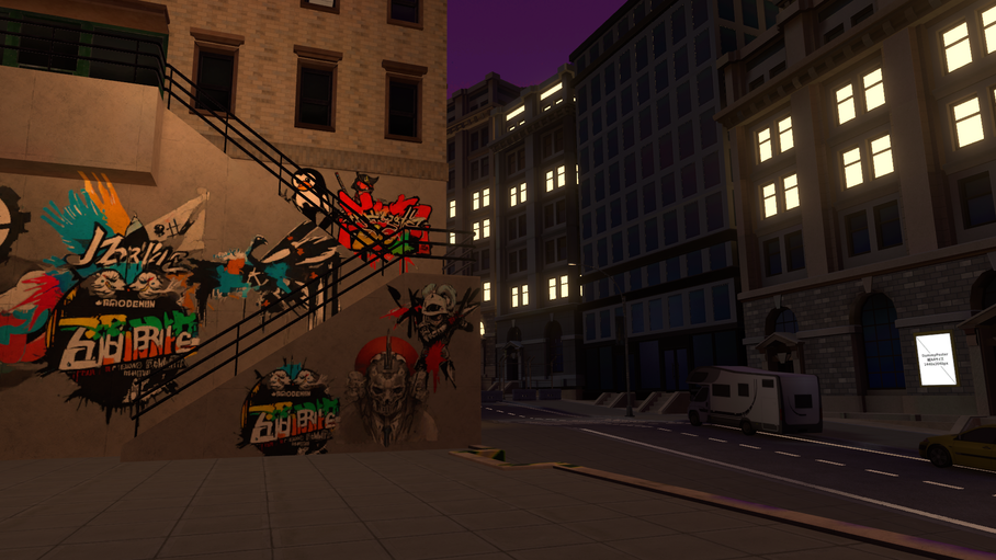 ヒーローとヴィランが日夜戦いを続ける街。NYのダウンタウン-ミッドタウンあたりをイメージして制作しています。建物は販売アセットの改変。地形の制作、昼夜差分の作成。ライティングとNPCイベントのコンテ、脚本を担当。町中にある大量のグラフィティをAI生成で行うという初の試みでした。